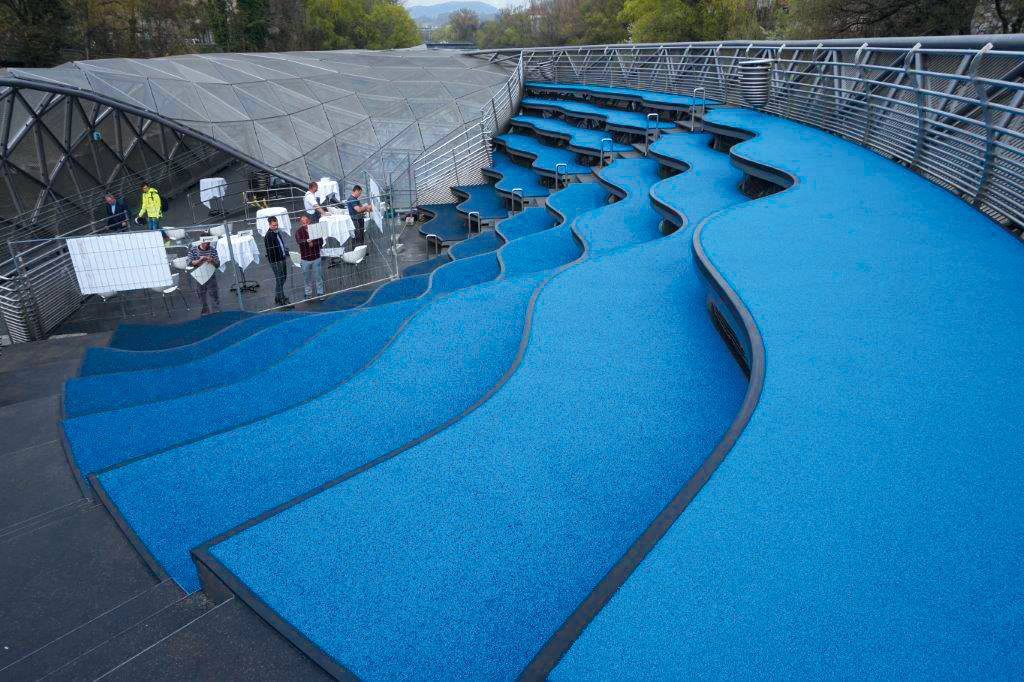 Qualitativ hochwertige Gummi­granulat-Beschichtungen müssen in vielen Fällen starken Belastungen standhalten, aber auch ästhetischen Ansprüchen genügen. Wie beispielsweise bei dieser Arbeit an der Murinsel in Graz, bei der der Boden beschichtet wurde.