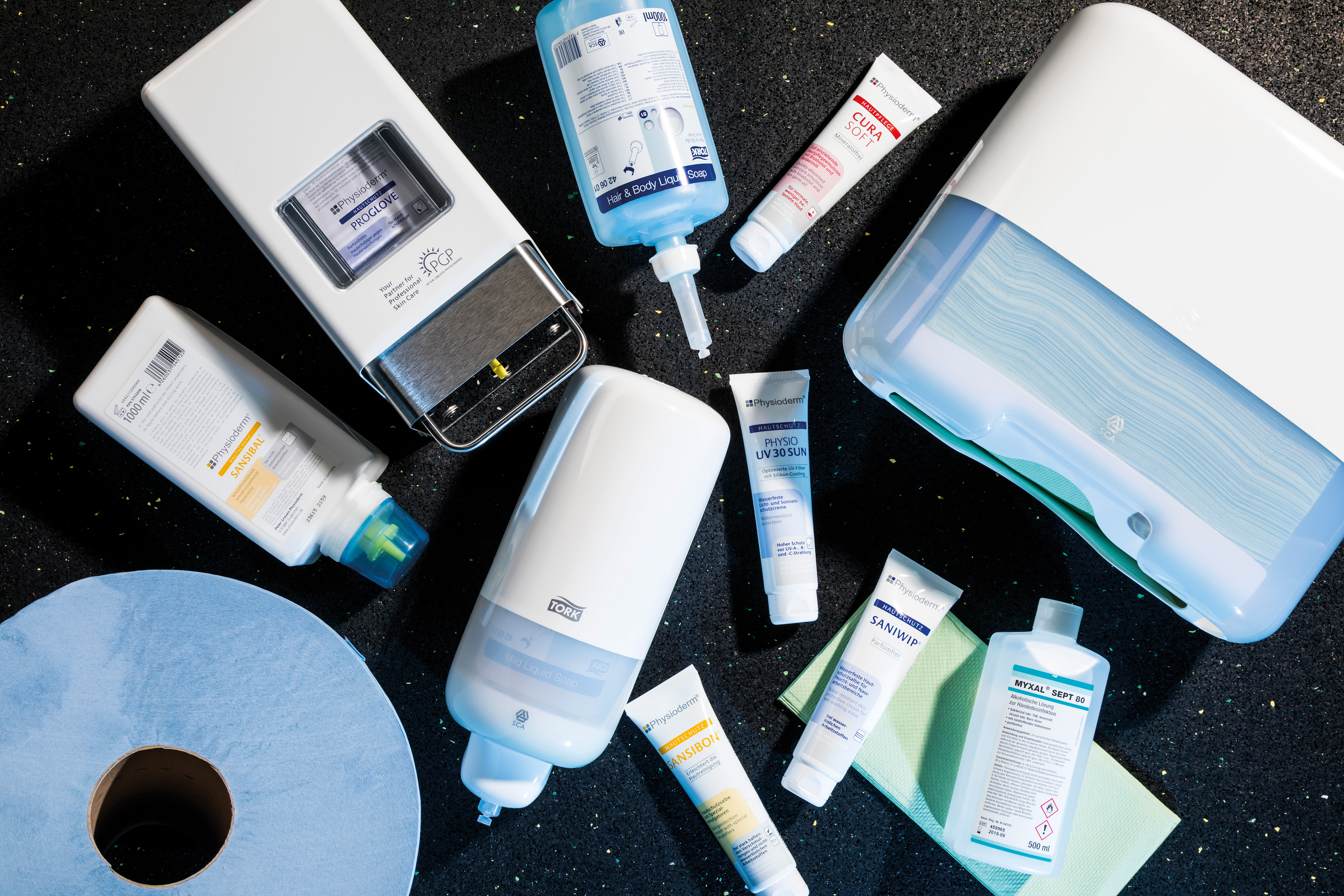 Tesa-Klebebänder, Schleifmittel, Verpackung, TORK-Reinigungsprodukte